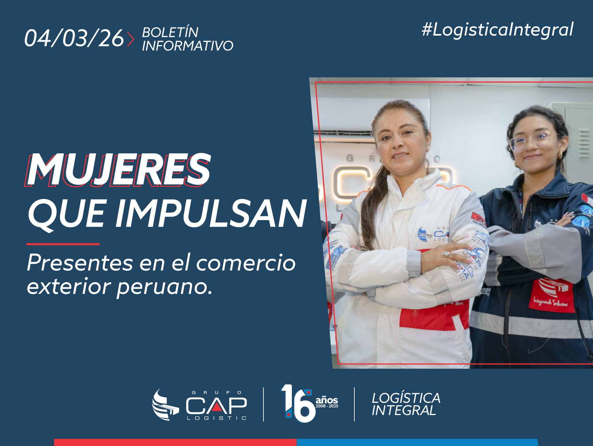 El crecimiento del liderazgo femenino también impacta la cadena logística, un pilar fundamental para el éxito de las exportaciones. En Grupo CAP Logistic, una parte importante de los procesos operativos y de gestión son liderados por mujeres, reflejando el avance hacia equipos más diversos, estratégicos y orientados a la excelencia.